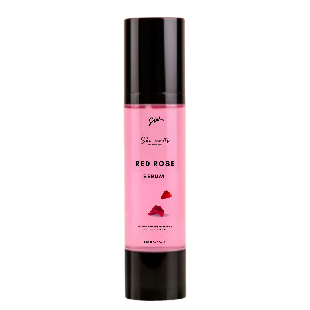 “Romance Your Hair with Every Drop.” Not just a serum — a sensory symphony. She Wants Professional Red Rose Hair Serum is the essence of elegance, bottled. Crafted with concentrated red rose extracts and enriched with rejuvenating actives, each application revives the hair’s natural vitality while delivering: Botanical Rejuvenation – Rose oil helps to repair and shield strands from dryness, UV, Satin Finish – Seals cuticles for a flawless, frizz-free look. Created for the woman who turns heads without trying — because her hair speaks in roses.